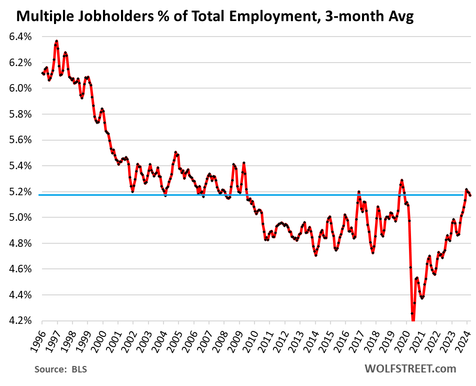 Multiple job holders as percent of total workers have dipped in recent months and remain in the normal range over the past 20 years, but are much lower than in the 1990s and early 2000s: