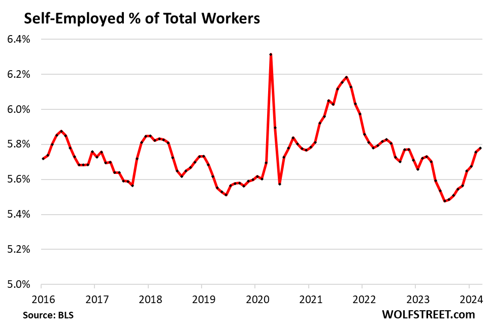 Self-employed workers as percent of total workers have remained in the normal range, having come up from the historic low during the labor shortages: