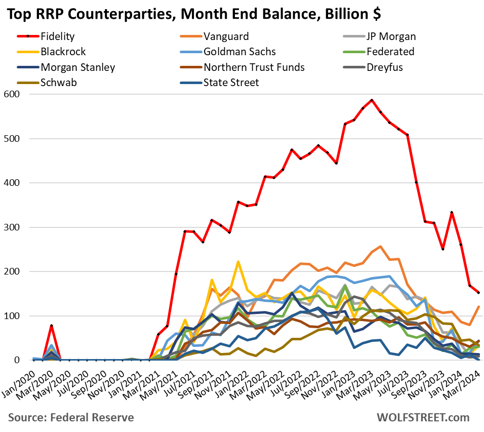 Below are the largest MMF counterparties of ON RRPs, at the end of every month. The bank names are the money market funds provided by that bank.