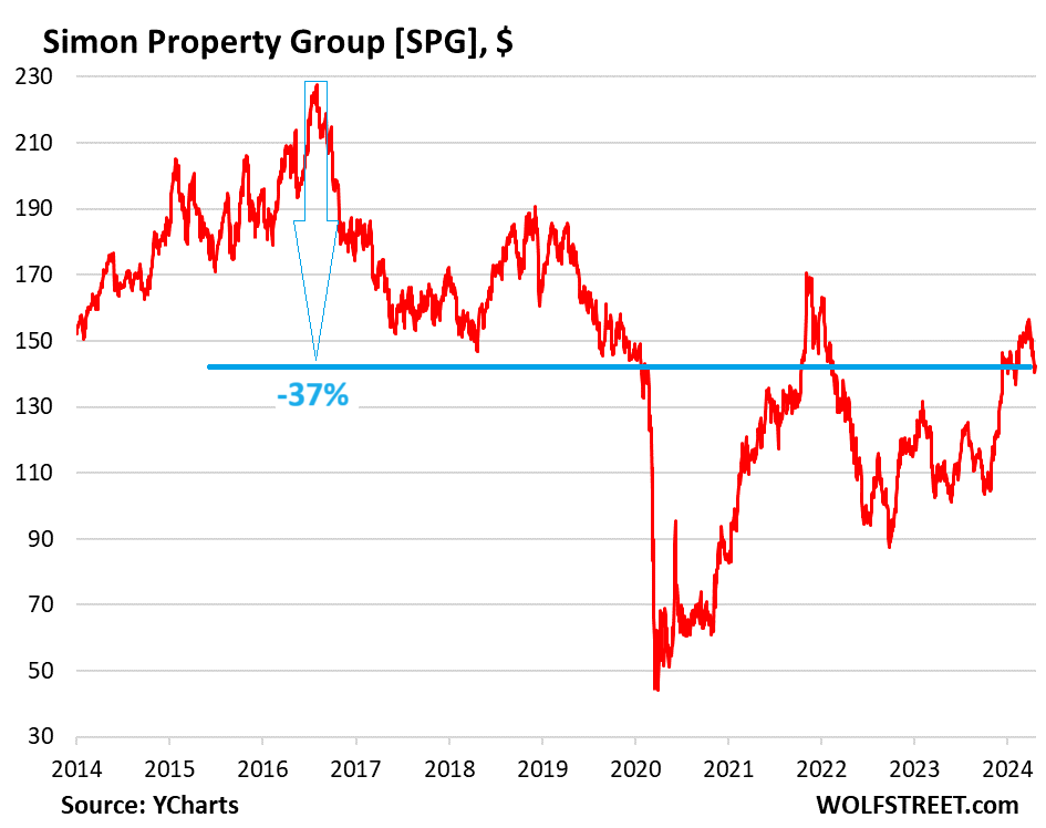 Here is SPG’s stock price, last 10 years. The stock is down 37% since the all-time high in July 2016, about the time I started using “brick-and-mortar meltdown.” SPG is still in pretty good shape. A bunch of mall REITs have already filed for bankruptcy.