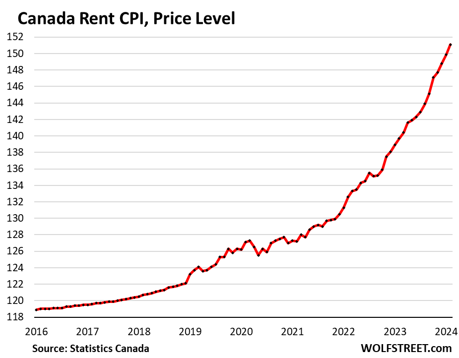 Rents in Canada are going the opposite way, they’re spiking out the wazoo under the tsunami of immigrants: