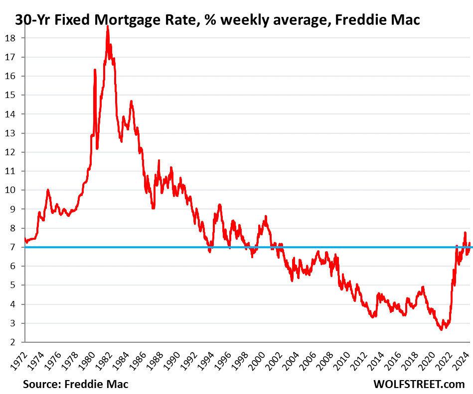 These mortgage rates are not high compared to the pre-QE era. From 1970 through 2001, mortgage rates ranged from 7% to 18%. What was different then that allowed those rates to function were the lower home prices. When mortgage rates dropped below 7% in 2002 and eventually as low as 5.5% in 2005, they fueled Housing Bubble I, which led to the Housing Bust from 2006-2012. So these 7% rates are fairly healthy rates: