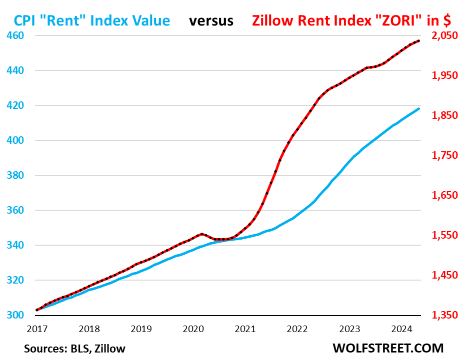 “Asking rents…” The Zillow Observed Rent Index (ZORI) and other private-sector rent indices track “asking rents,” which are advertised rents of vacant units on the market. Because rentals don’t turn over that much, the ZORI’s spike in 2021 through mid-2022 never fully translated into the CPI indices because not many people actually ended up paying those asking rents.