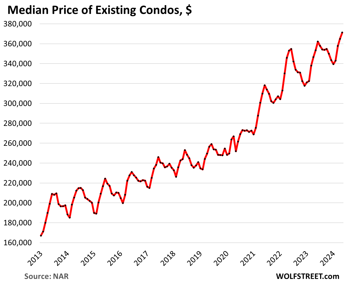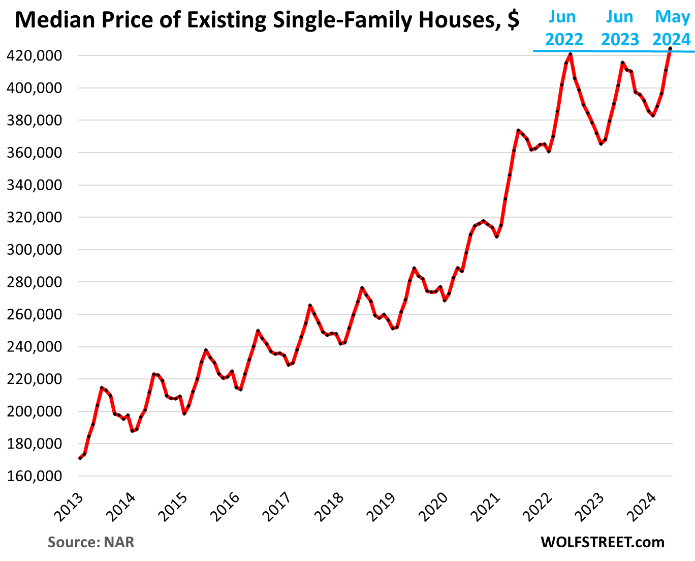 The median price of single-family houses jumped to $424,500, amid that surge in sales of high-end homes that skewed the median price and shifted it higher (see our detailed discussion of how that works here). It eked out a new all-time high, up by 0.9% from the prior high in June 2022: