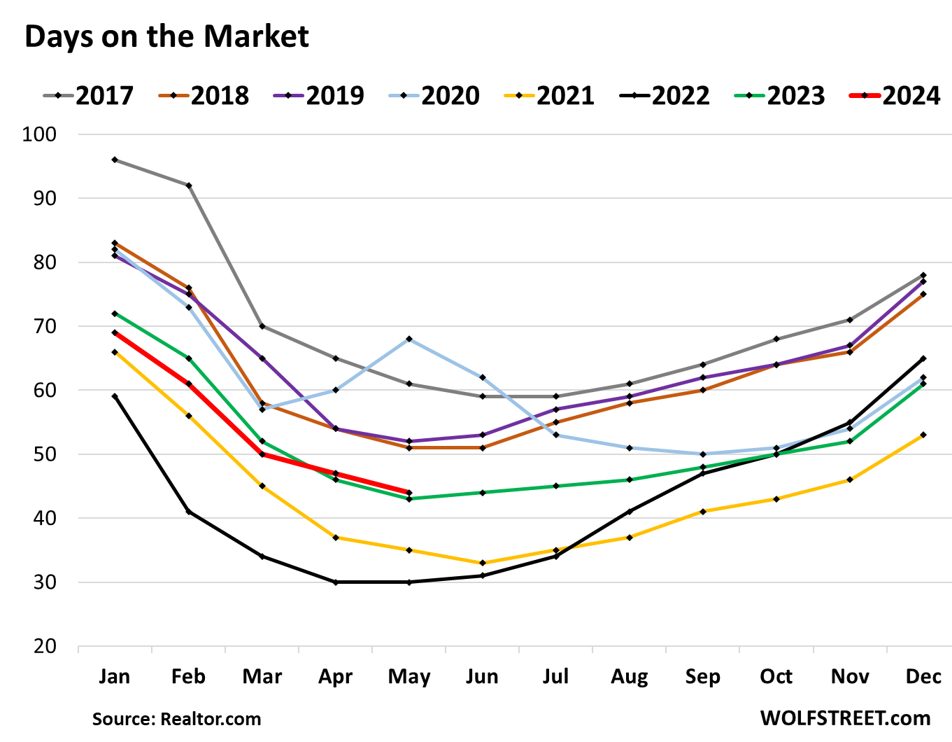 Days on the market – until the home is either sold or pulled off the market – at 44 days, was the highest for any May since 2020.