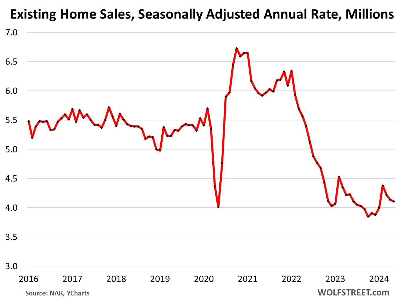 Still dogged by mortgage rates milling around in the 7% neighborhood, and by people’s urge to wait for lower mortgage rates before buying, sales of existing homes of all types – single-family houses, townhomes, condos, and coops – fell further in May from April on a seasonally adjusted basis, to an annual rate of 4.11 million homes, just a notch above the low points in late 2023 which had been the lowest since the depth of the Housing Bust in 2010, according to the National Association of Realtors today.