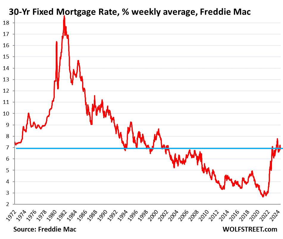 The average 30-year fixed mortgage rate has been between 6.5% and 7.5% since late 2022, reaching 7% in October 2022, according to the measure by Freddie Mac. In the latest week, mortgage rates averaged 6.87%. While that seems high after 14 years of interest-rate repression through 0% policy rates and QE that caused home prices to spike, those rates would have seemed like a pretty good deal during more normal times