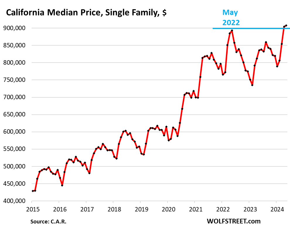 The median price of single-family houses jumped to $424,500, amid that surge in sales of high-end homes that skewed the median price and shifted it higher (see our detailed discussion of how that works here). It eked out a new all-time high, up by 0.9% from the prior high in June 2022: