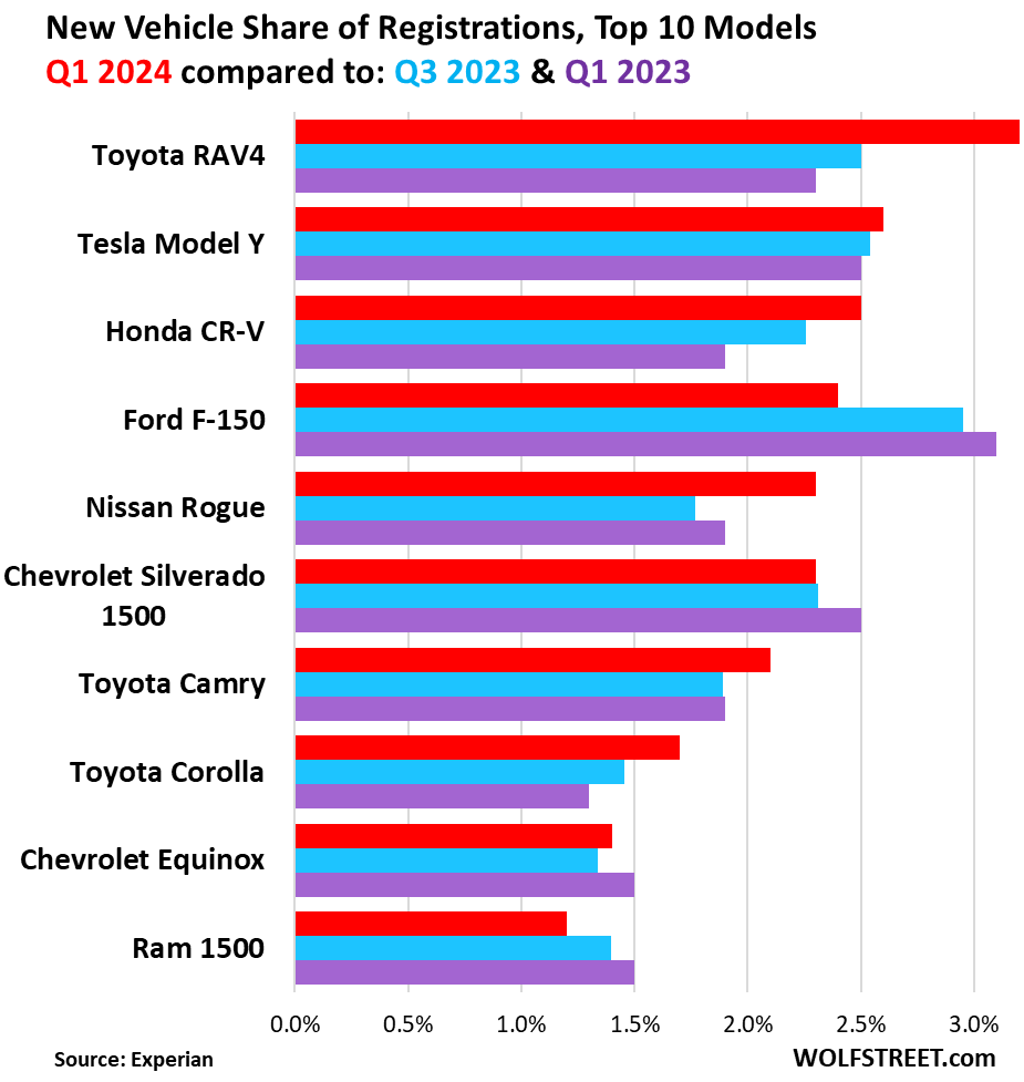The red bars indicate the market share in Q1 2024. The purple bars indicate the share a year ago. Note the F-150’s big purple bar, and how its market share withered. The Model Y gained a little share throughout. The Honda CR-V recovered from inventory shortages that had dragged into 2023.