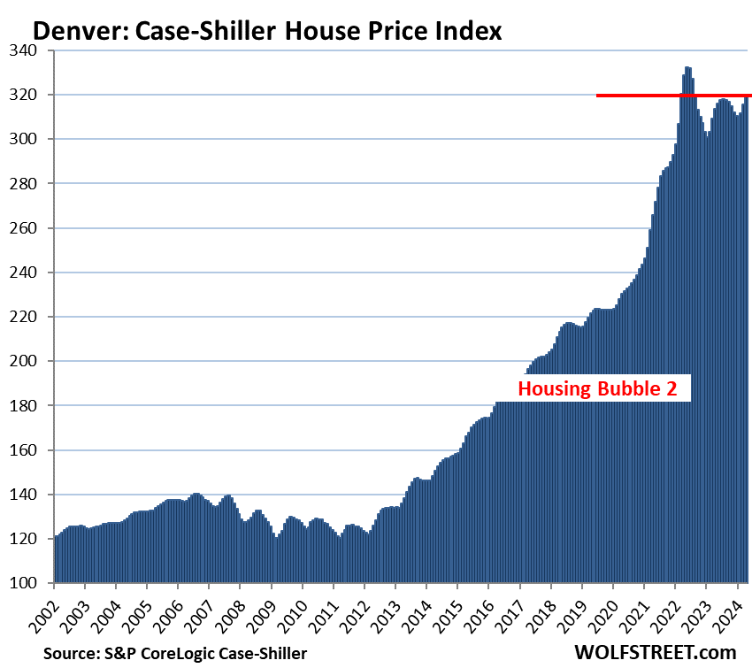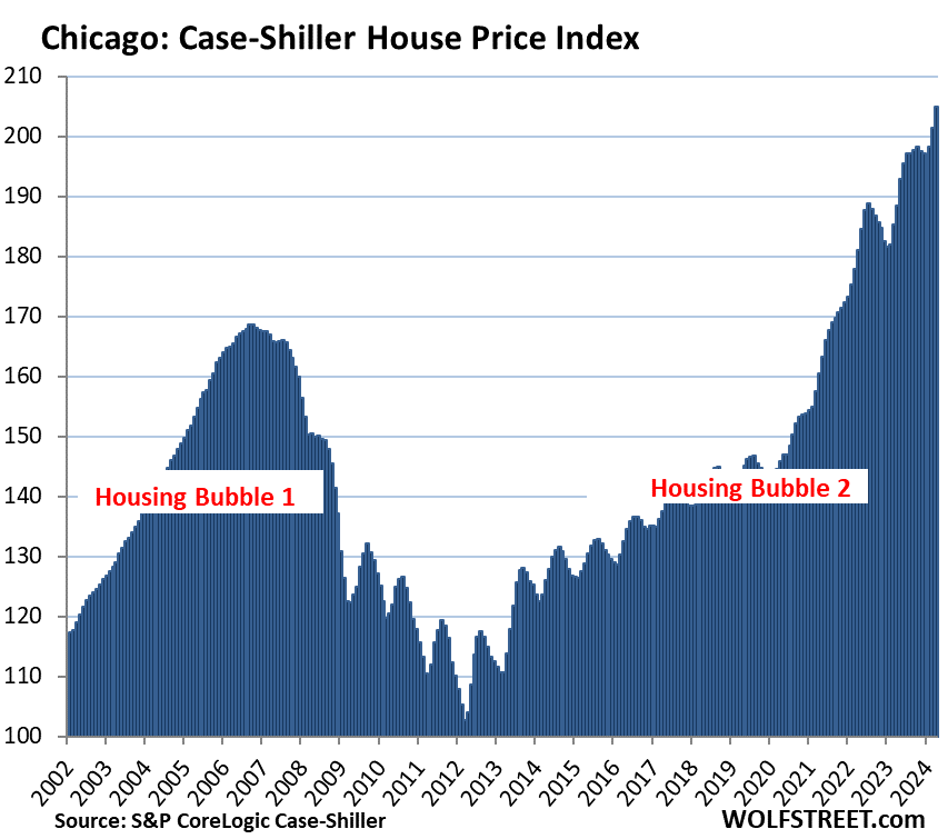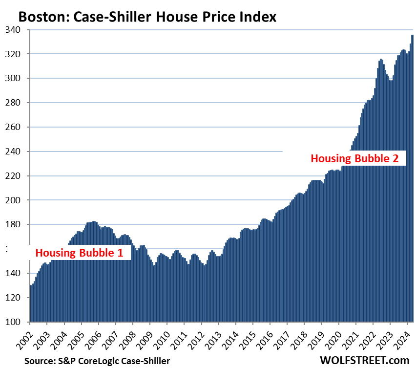 Chicago, with an index value of 205 is up by 105% from the year 2000, and therefore far from qualifying for this list. But the 44% price spike since the Fed started its money-printing binge in March 2020 has been splendid nevertheless, so here it is anyway: