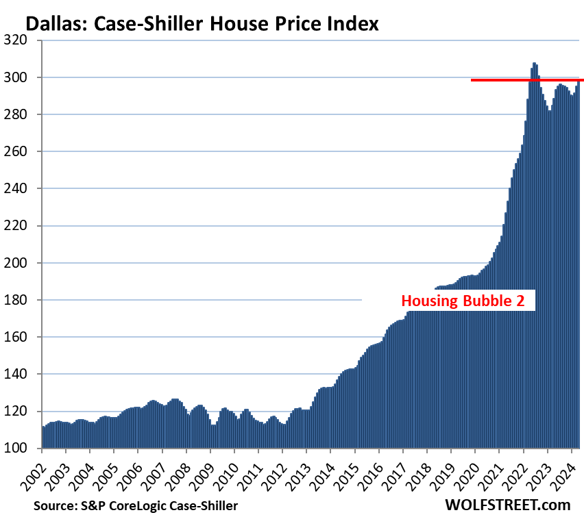 Unlike many states, Texas does not require disclosure of actual prices paid. Wolf would have better information on the methodology Case Shiller uses to compute the values for Dallas, but my understanding is that it is far more laborious than for houses in other states, which is why they don’t do it for other big Texas cities.