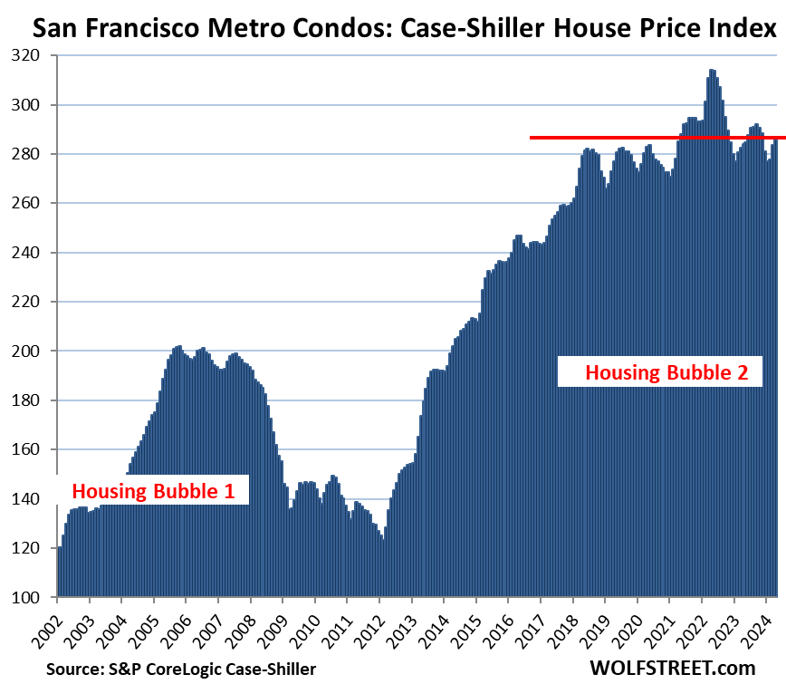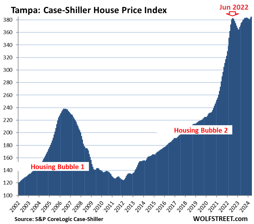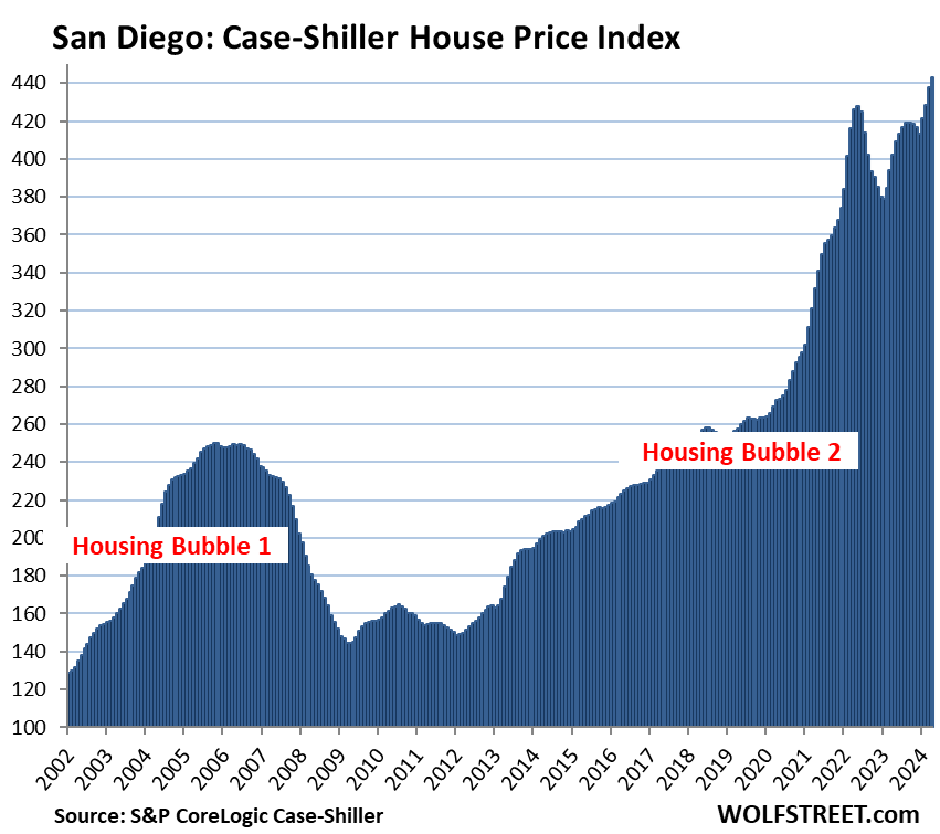 To qualify for the Most Splendid Housing Bubbles, the metro must have experienced home-price inflation since 2000 of about 200% or more at the peak. The indices were set at 100 for the year 2000. Today’s index value for San Diego of 443 is up 343% since 2000, making San Diego the most splendid housing bubble on this list, ahead of Miami and Los Angeles.
