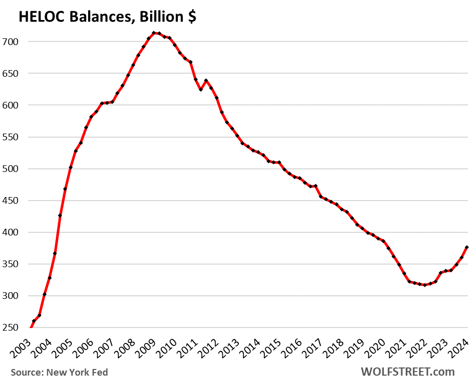 Cash-out refis have collapsed with higher interest rates. So the equity withdrawal has shifted from cash-out refis to other methods. And those numbers are rising but still minuscule in the overall numbers. Here are HELOC balances, at $380 billion compared to $12.3 trillion in mortgage balances.
