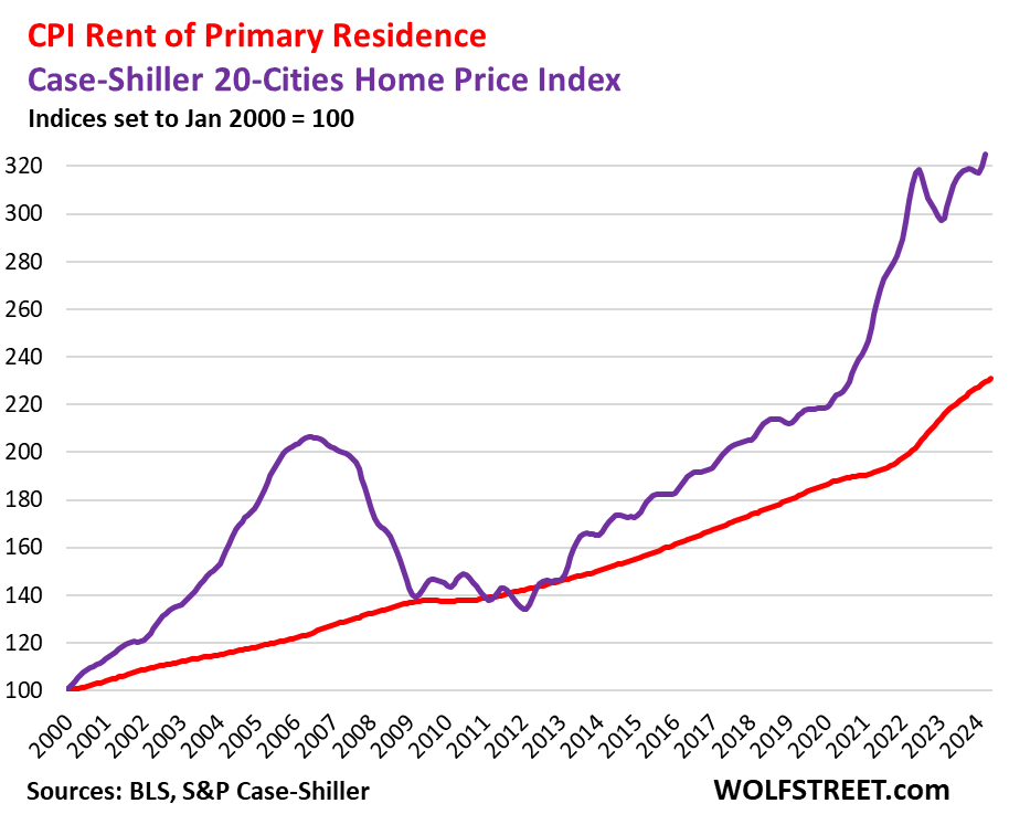 Home-Price Inflation. The Case-Shiller Index uses the “sales pairs” method, comparing sales in the current month to when the same houses were sold previously. Price changes are weighted based on how long ago the prior sale occurred. Adjustments are made for home improvements and other factors (37-page methodology). By measuring how many dollars it takes to buy the same house over time, the Case-Shiller index is a measure of home-price inflation. San Diego had 343% home price inflation since 2000. Over the same period, the consumer price inflation, as measured by CPI, amounted to 86%.