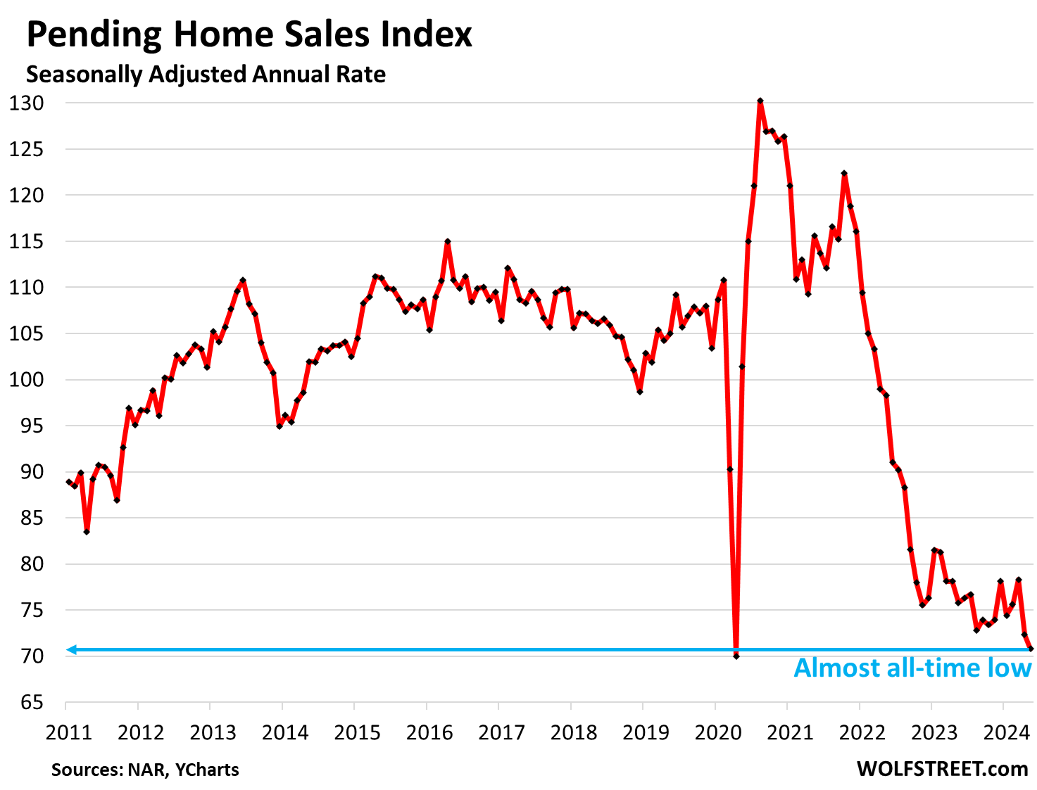 The index value of pending home sales in May dropped by 2.1% from April, and by 6.8% from a year ago, to 70.8 (seasonally adjusted annual rate), what headlines dubbed an “all-time low” or “record low” in the data going back to 2001, and that’s close enough. In the NAR data we have access to via YCharts, today’s reading was still a hair above the prior all-time low of April 2020 (index value of 70). But the idea is the same: demand has collapsed, even as inventories have risen.