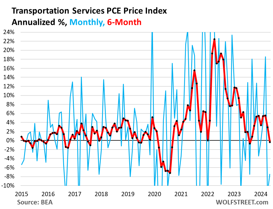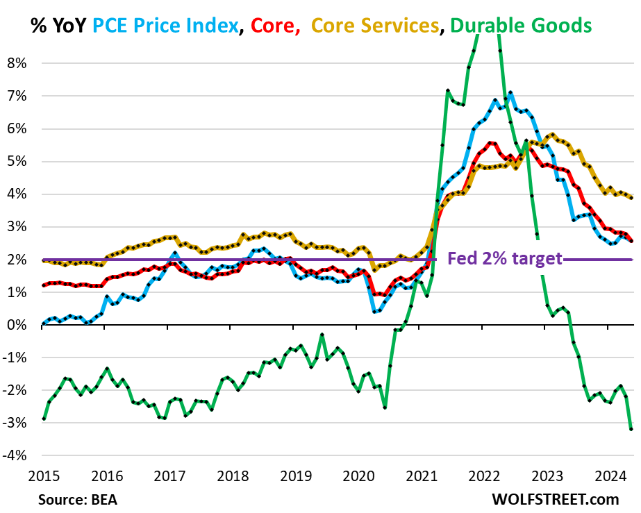 Boeing has absolutely zero to do with it. The PCE (“Personal Consumption Expenditures”) price index for durable goods measures price changes in durable goods that consumers buy (cars, trucks, fridges, computers, tools, furniture). Consumers usually do not buy Boeings. I mean, as we know, Americans are maxed out on their credit cards, live from paycheck to paycheck, don’t have enough money for a $400 repair, and don’t have space left in their garage for a Boeing, and so they don’t buy many Boeings.