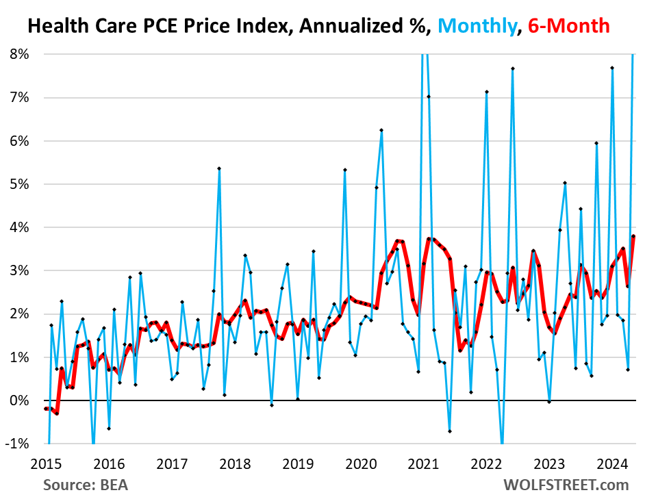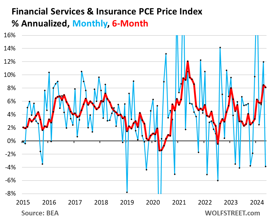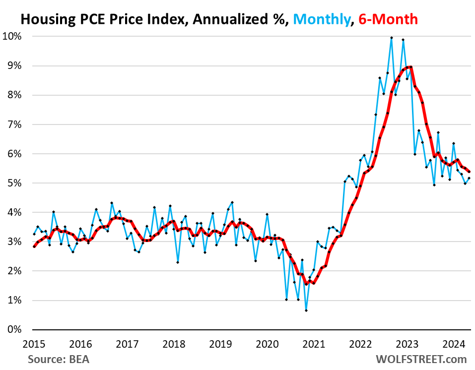Fed speakers constantly point at the way-too-high core services inflation; and they have been hoping and predicting that housing would cool dramatically, and it did for a while, and then it didn’t. Since August last year, the month-to-month PCE price index for housing inflation has hovered in the 5.0% to 6.0% range.
