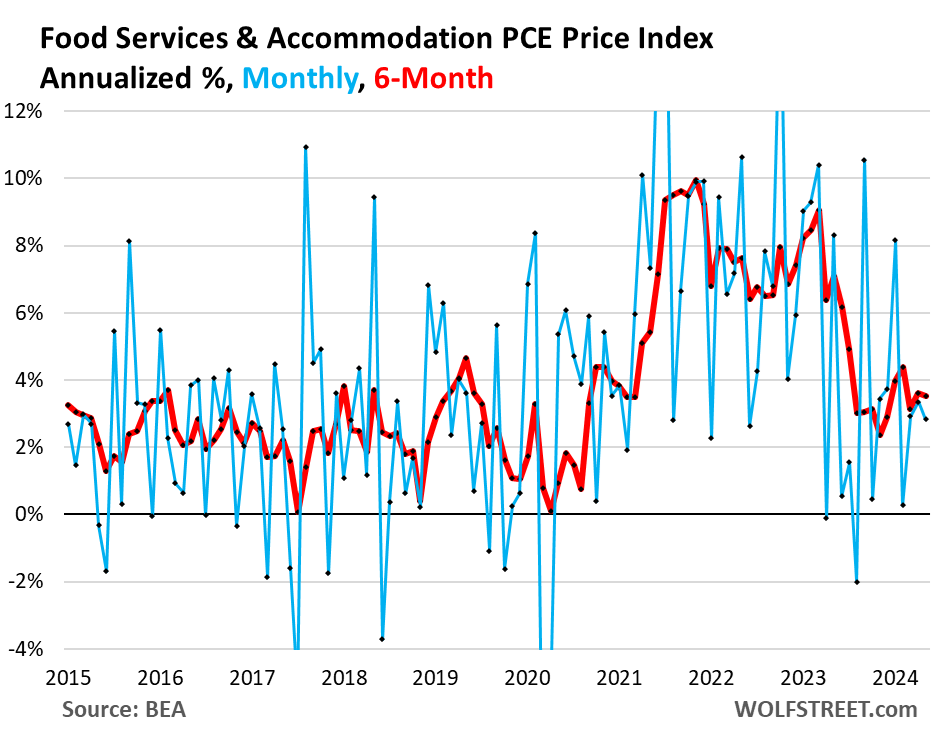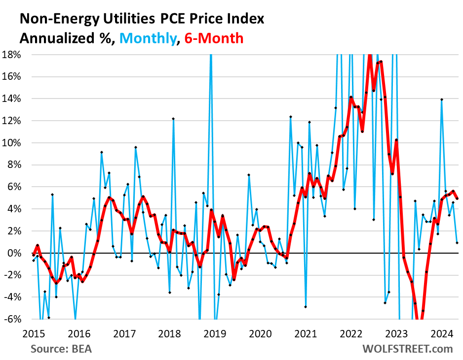 The remaining core services components are super-volatile, with massive spikes and drops month-to-month that often shoot through or plunge off the charts. Clearly, with this kind of volatile month-to-month data, one month doesn’t make a trend. In fact, they’re so volatile month-to-month that even the six-month readings have big squiggles. Anyway, for your amusement: