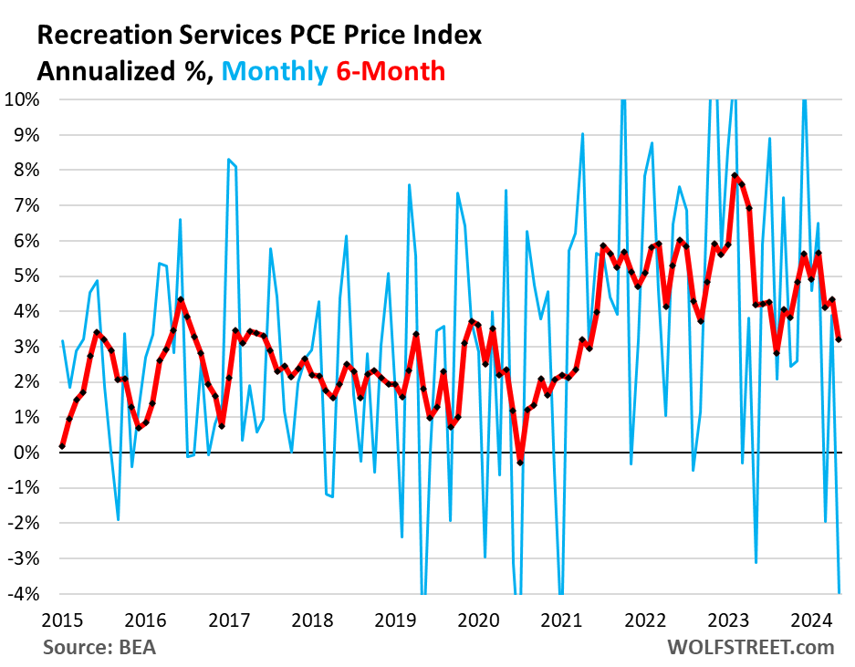 Recreation services PCE price index (cable, satellite TV & radio, streaming, concerts, sports, movies, gambling, vet services, package tours, maintenance and repair of recreational vehicles, etc.):