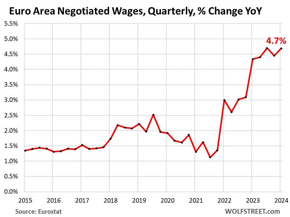 The forward-looking wage-growth measure that the ECB developed, based on newly negotiated collective bargaining agreements whose wage increases will be implemented in the future, jumped by 4.7% year-over-year, matching the Euro Area record of Q3 2023: