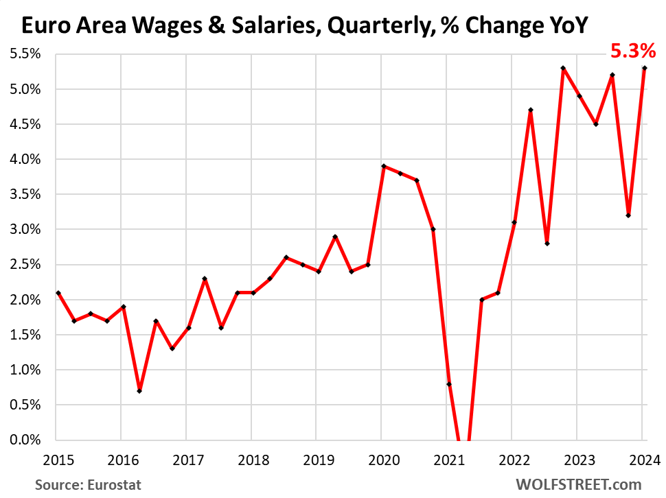 Alas, wages and salaries jumped by 5.3% year-over-year in Q1, matching the record of Q4 2022. In Germany, they jumped by 6.3%, in the Netherlands, by 7.6%, in Austria by 9.8%, in Greece by 7.9%, in Portugal by 6.3%, in Spain by 4.5%. On the low side were France (+2.6%) and Italy (+3.3%).
