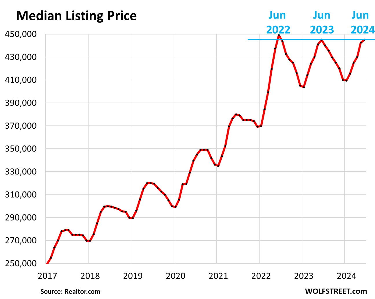 Every year around June, the median listing price peaks seasonally and then falls off through January. In June 2024, listing prices were flat with June 2023 and a hair below June 2022. This is forming a beautiful triple top, with the first top having been the highest, and now the active listings are piling up too and the (tiny?) price reductions off those still too high listing prices can’t move the inventory.