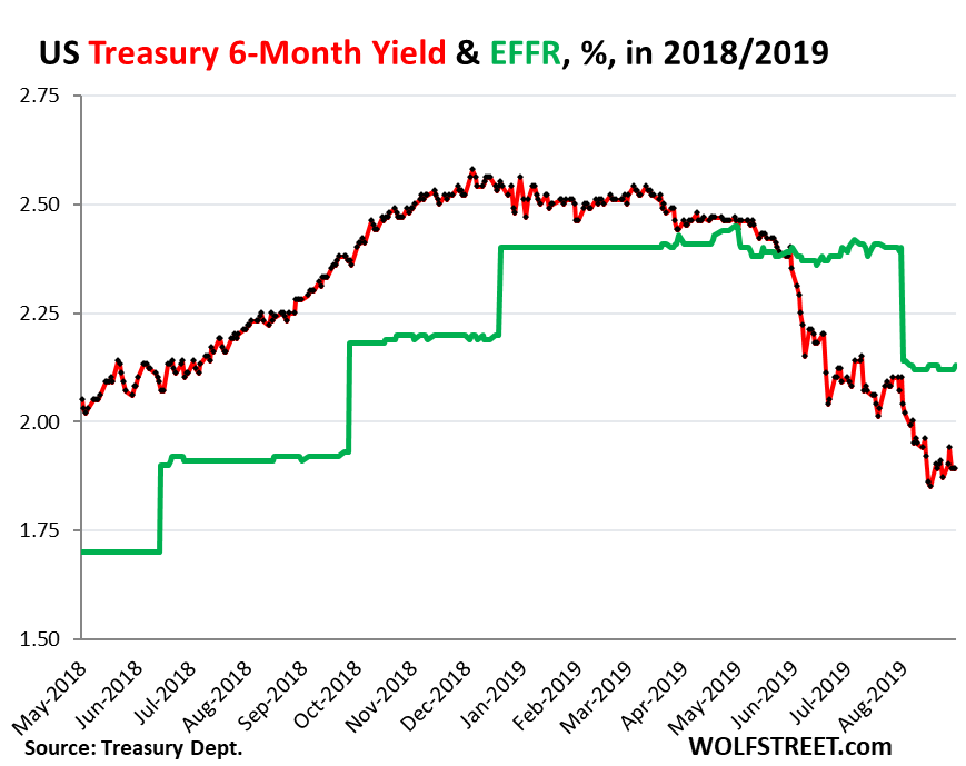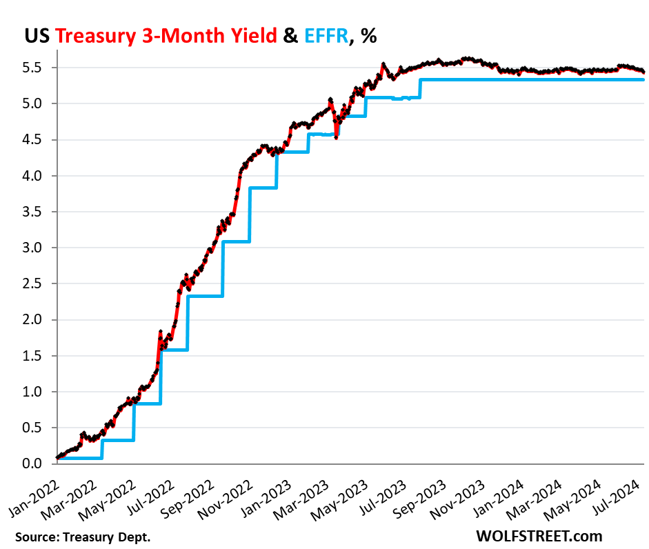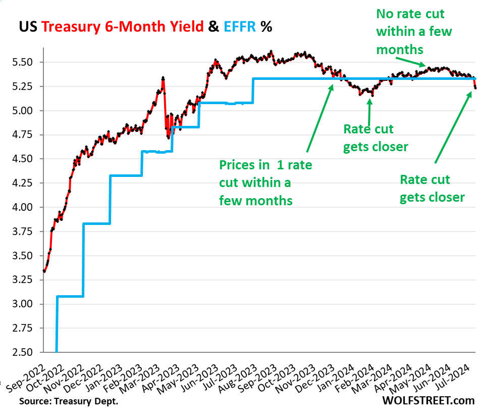 It brought the 6-month yield just a tad below the lower end of the Fed’s target range for the federal funds rate (5.25-5.50%), and below the effective federal funds rate (EFFR), currently 5.33% (blue in the chart below):
