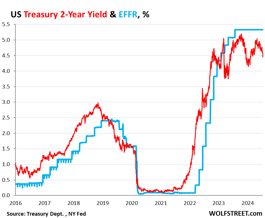 The 2-year yield closed at 4.45% on Friday. The market never once came even close to betting that the Fed would hold rates above 5% for long, and they’ve been above 5% for over 14 months. And the 2-year yield has been below the EFFR for almost the entire time since January 2023, having turned into the Doubting Thomas.