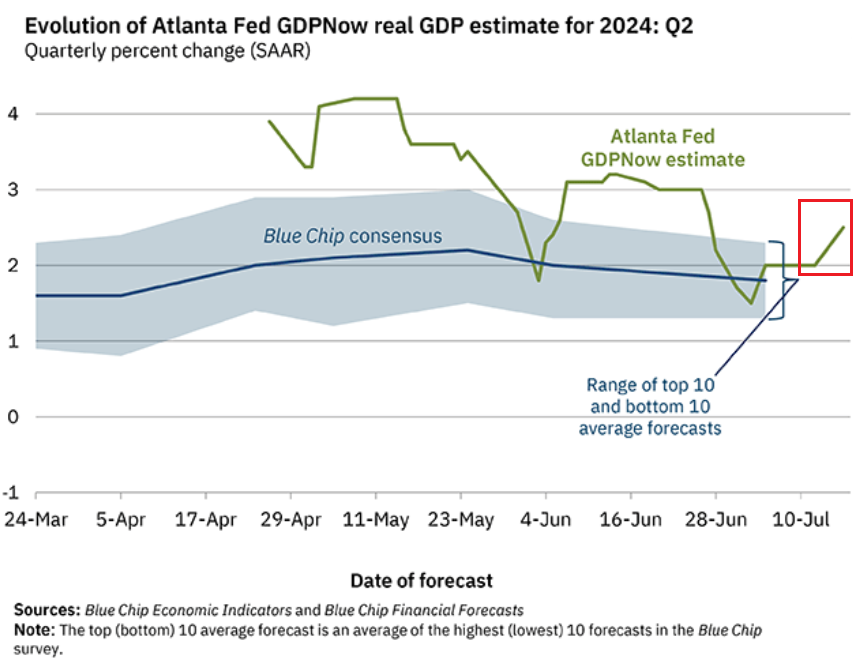 The Atlanta Fed’s GDPNow forecast for Q2 real GDP was updated today with the data from June retail sales, which caused its real GDP forecast to jump to 2.5% today, from 2.0% last week. For the US, 2.5% real GDP growth is well above the longer-run average of just under 2%. GDPNow’s measure for real consumer spending growth rose to 2.1% from 1.6%.