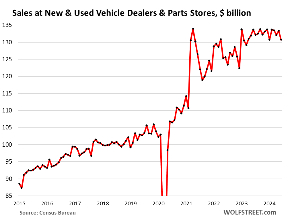 New and used vehicle dealers and parts stores (19% of total retail). Note the 2% month-to-month drop in June, mostly due to 15,000 dealers not being able to process sales after the CDK hack.