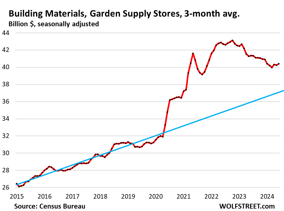 Building materials, garden supply and equipment stores (6% of total retail). The prepandemic trendline in blue: