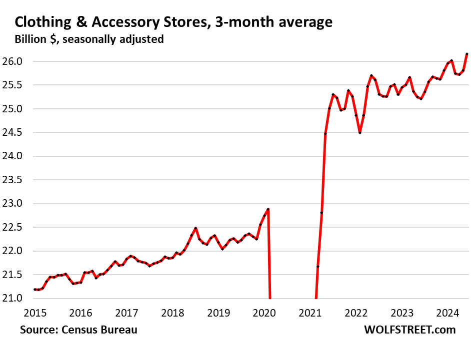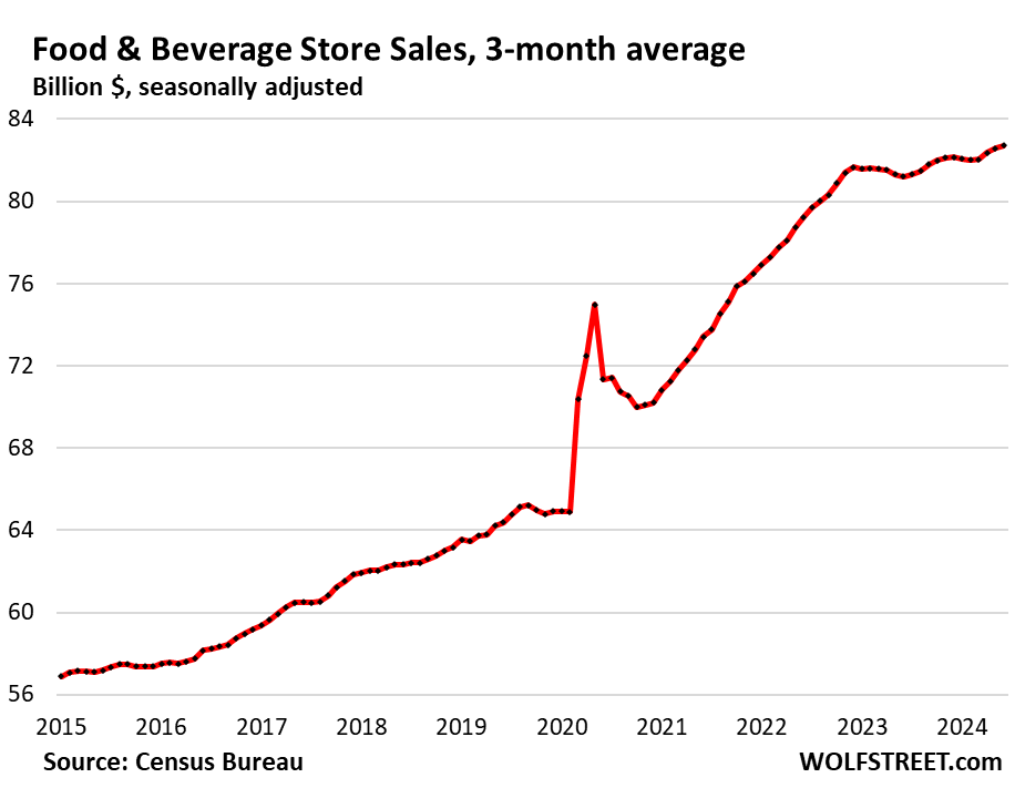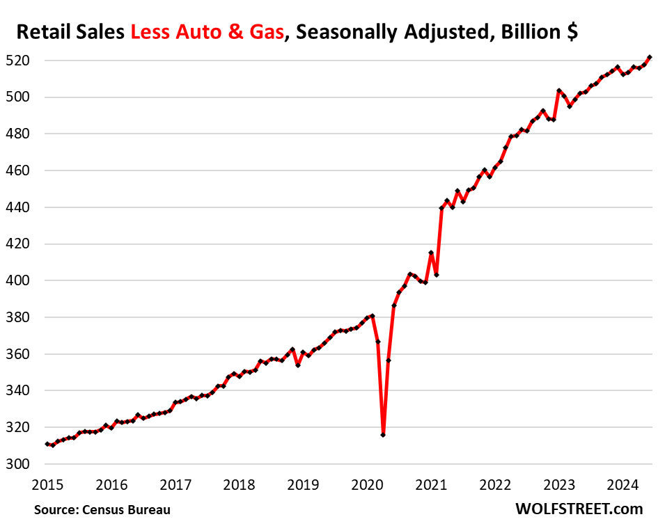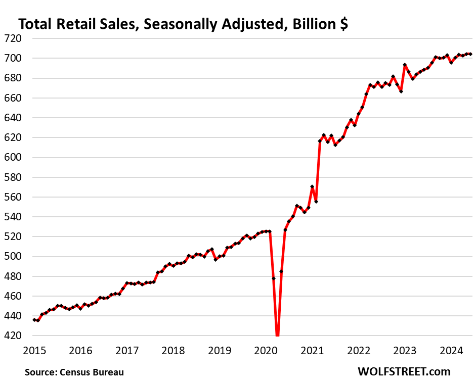 Total Retail sales were unchanged in June from May, at $704 billion, seasonally adjusted, and were up 2.3% year-over-year, despite the ransomware hack and the widespread price declines in goods, that included motor vehicles, electronics, furniture, and many other goods.
