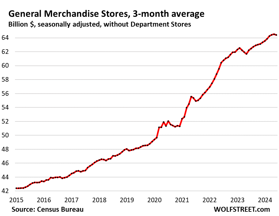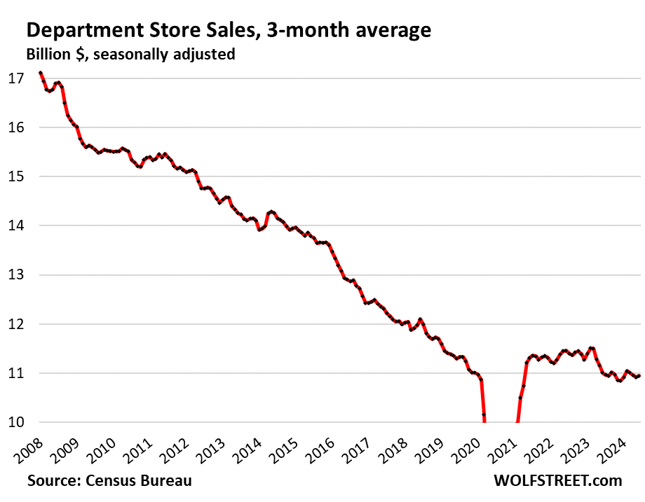 Department stores (now down to just 1.5% of total retail sales, from around 10% in the 1990s). Ecommerce sales by department store chains are not included here, but are included in ecommerce retail sales above. This chart is the epitome of what we started to document in 2016 in our column, Brick and Mortar Meltdown: