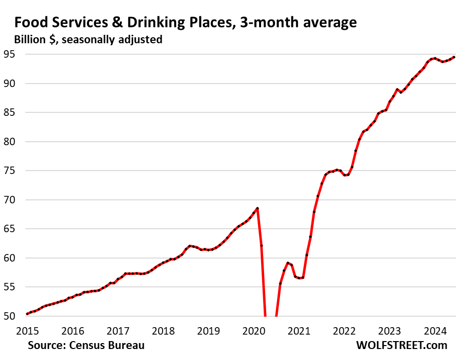 Food services and drinking places (restaurants, cafes, bars, etc., 13% of total retail). The chart shows the three-month moving average (3mma). You can see the slow-down earlier this year, and the re-acceleration over the past three months: