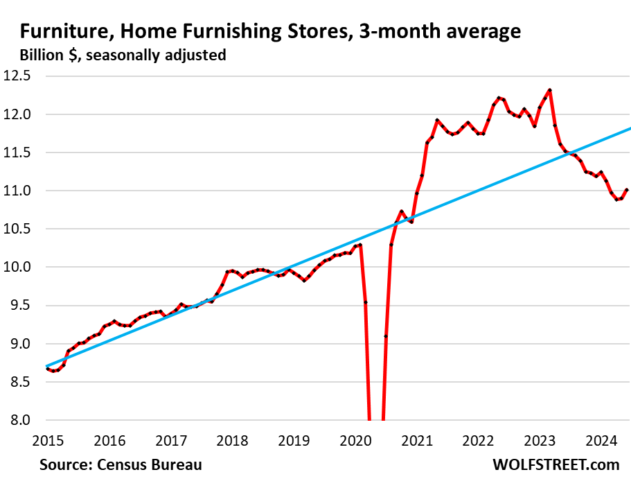 Furniture and home furnishing stores (1.6% of total retail). Much of furniture and furnishing sales have moved to ecommerce. This is what’s left over at brick-and-mortar retailers that specialize in furniture and furnishings.