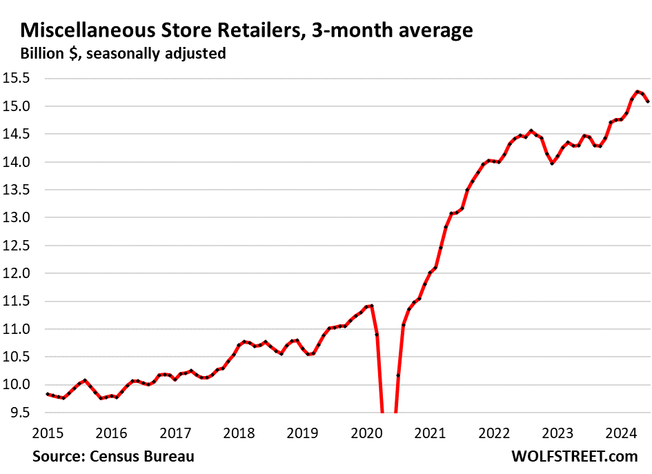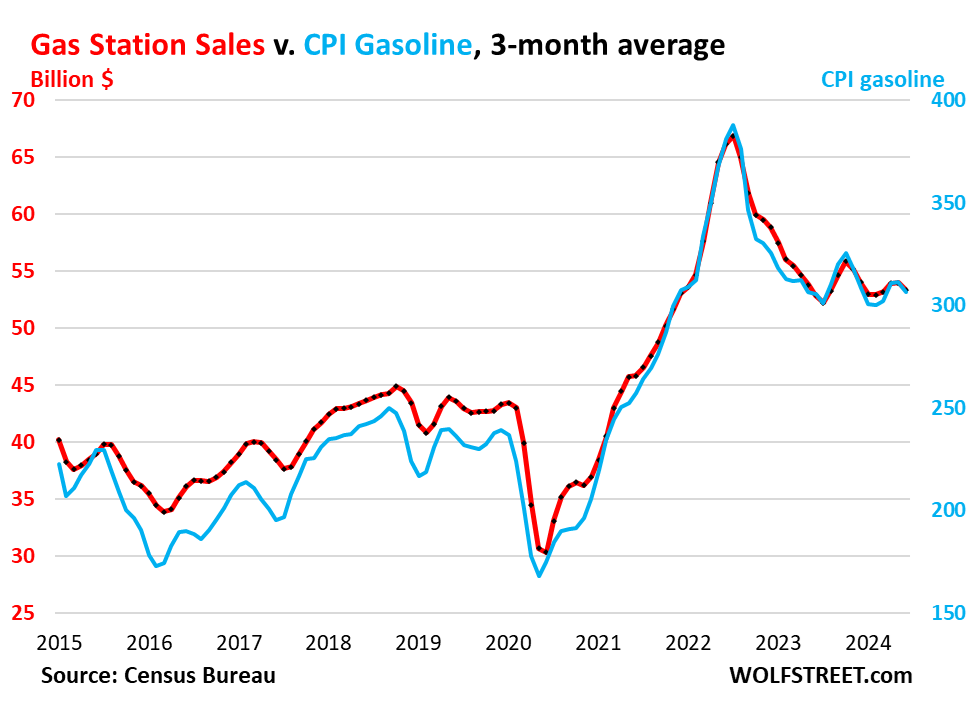 Gas stations (8% of total retail sales). Sales at gas stations move in near-lockstep with the price of gasoline, and the price of gasoline dropped over the past months, and so sales in dollars dropped: