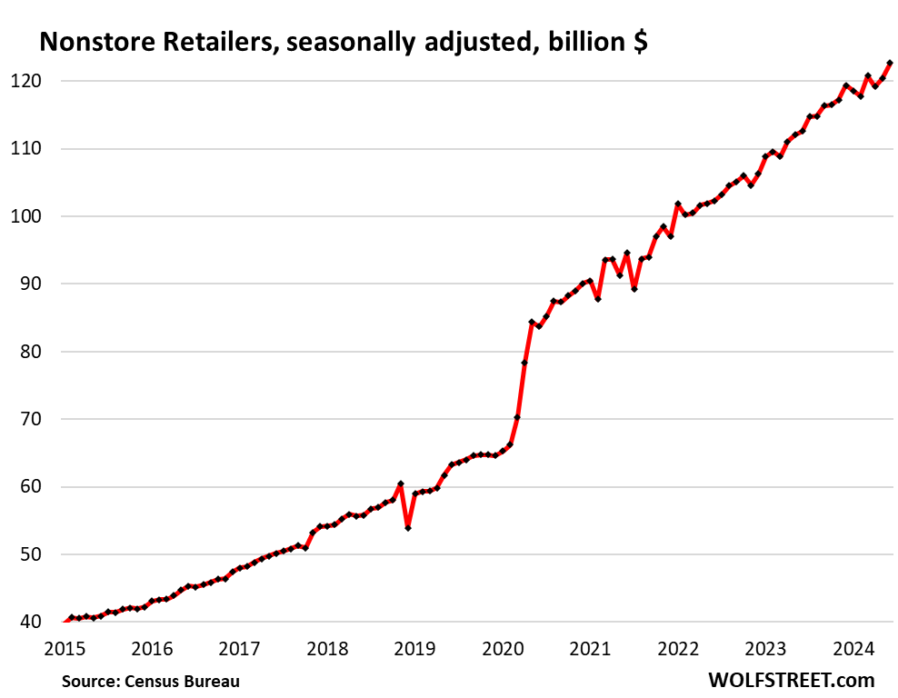 Retail sales without gasoline and auto sales jumped by 0.8% in June from May, seasonally adjusted, the biggest increase since January 2023, spread among many categories of retailers, including a massive increase in ecommerce sales. Year-over-year, they rose 3.8%. This month-to-month jump caused the Atlanta Fed to raise its GDPNow forecast for Q2 GDP growth to 2.5% today, from 2.0% last week.