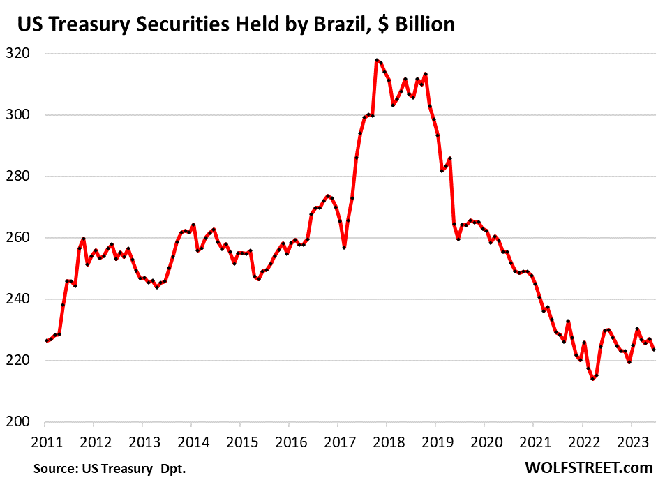 Brazil:  $223 billion, -3.0% YoY. Between 2018 and 2021, Brazil cut its holdings by about one-third. Since then, its holdings have stabilized.