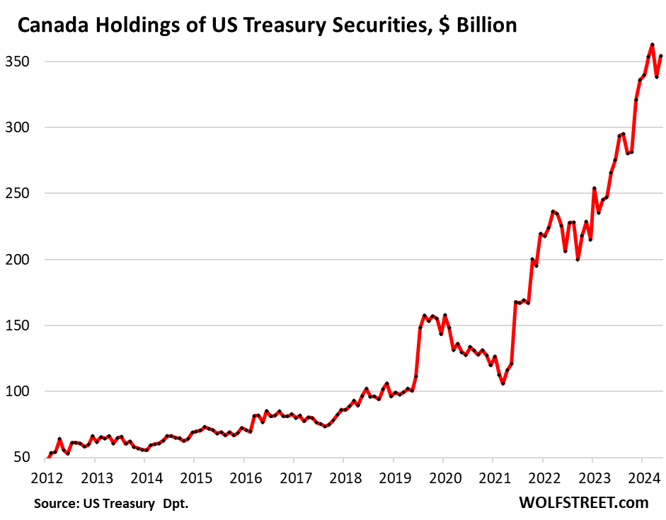 Canada: $354 billion, +33% YoY. Since March 2021, holdings have surged 233%, from $106 billion to $354 billion now. Over the past 12 years, holdings multiplied by 7!