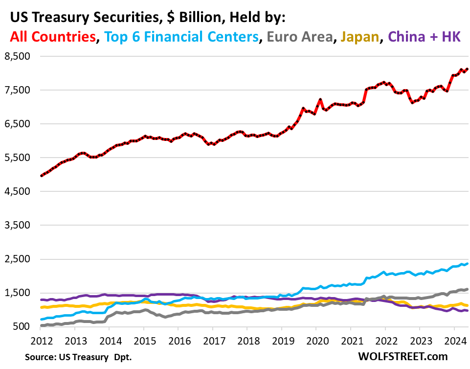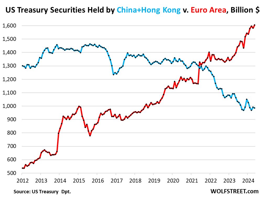 The countries of the Euro Area bought US Treasury securities hand-over-fist, tripling their holdings in 12 years, from $534 billion in 2012 to a record $1.61 trillion now (red).