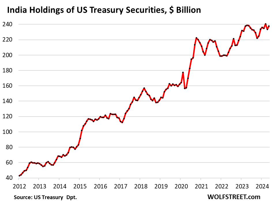 India:  $238 billion, -0.2% YoY. Treasury holdings have multiplied by 6 since 2012:
