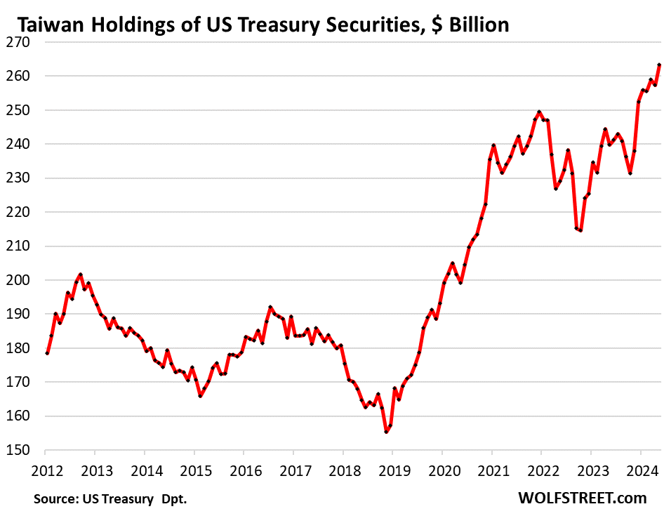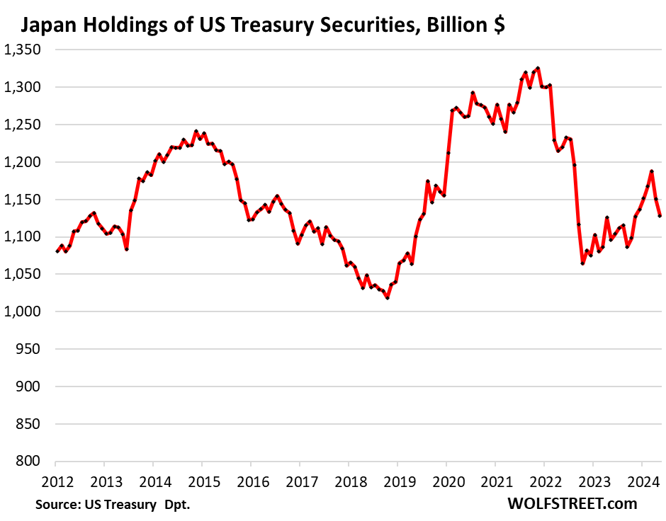 Propping up the yen: In April and May, holdings plunged by $60 billion. Japanese authorities later announced they blew $62 billion in the foreign exchange market in April and May, selling USD and buying JPY, to prop up the yen and to prevent it from falling through the 160 level. And it worked in April and May. But in June, the yen fell through the 160 level anyway.