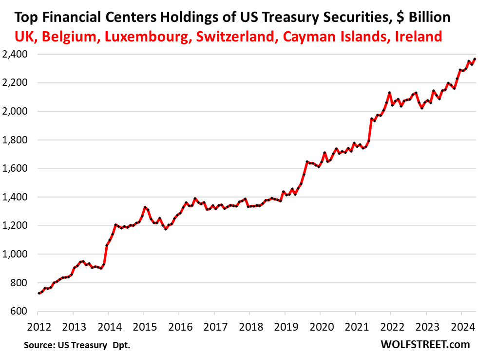 The six largest financial centers: +13.4% YoY to a record $2.37 trillion, having more than tripled since 2012! They are the UK (the City of London), Belgium, Luxembourg, Switzerland, Cayman Islands, and Ireland.
