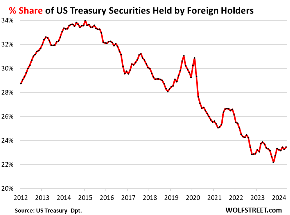 While foreign investors have continued to increase their holdings of Treasury securities over the years, the US debt has grown faster, and so the share of the debt that is held by foreign investors declined for many years, from a share of 33% in 2015 to a share of 22% at the low point in October 2023.