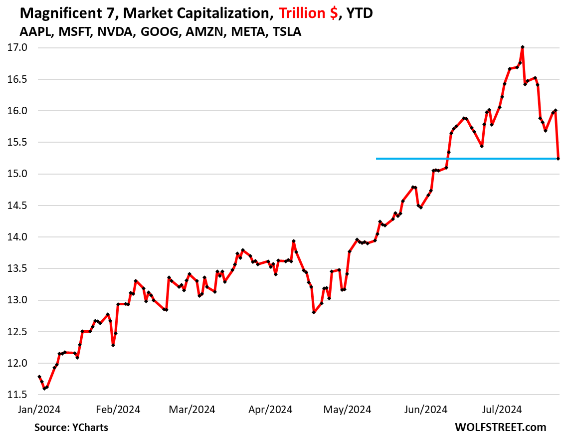 The Magnificent 7 – Apple, Microsoft, Nvidia, Alphabet, Amazon, Meta, and Tesla – dropped 4.8% today and are down 10.4% from their July 10 high. So as a unit, they entered a “correction.” And that’s about it so far. But in dollar terms, in those 10 trading days, the Mag 7 gave up $1.77 trillion in market capitalization, including another $765 billion today, which took them back not to Adam and Eve … but only to June 10. In two weeks, they gave up four weeks of gains.