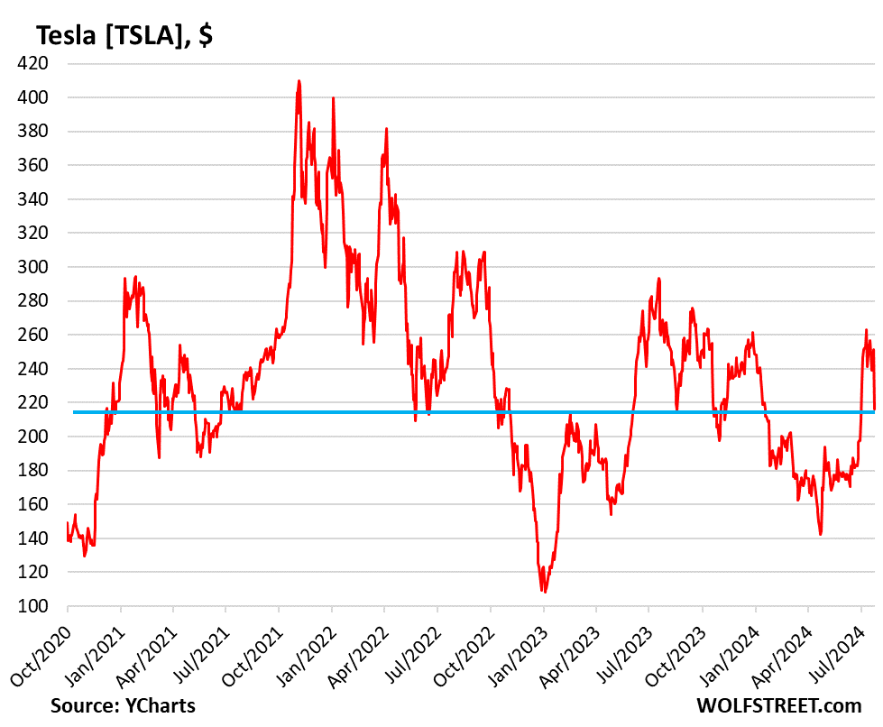 From its all-time high in November 2021, Tesla is now down 47.8%, and is back where it had first been in December 2020, Musk’s robotaxi-hype notwithstanding (Waymo’s robotaxis are working and taking fares).