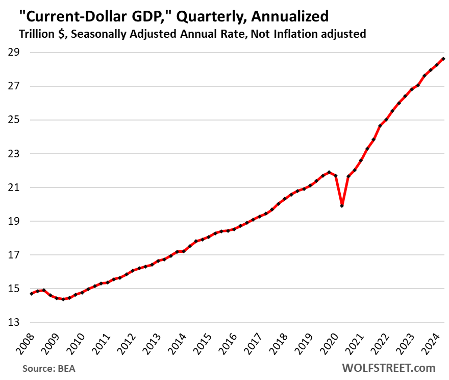 “Current-dollar” GDP in Q2 rose by 5.2% annualized to $28.6 trillion, according to the Bureau of Economic Analysis on Thursday (adjusted for inflation, “real” GDP rose 2.8%).