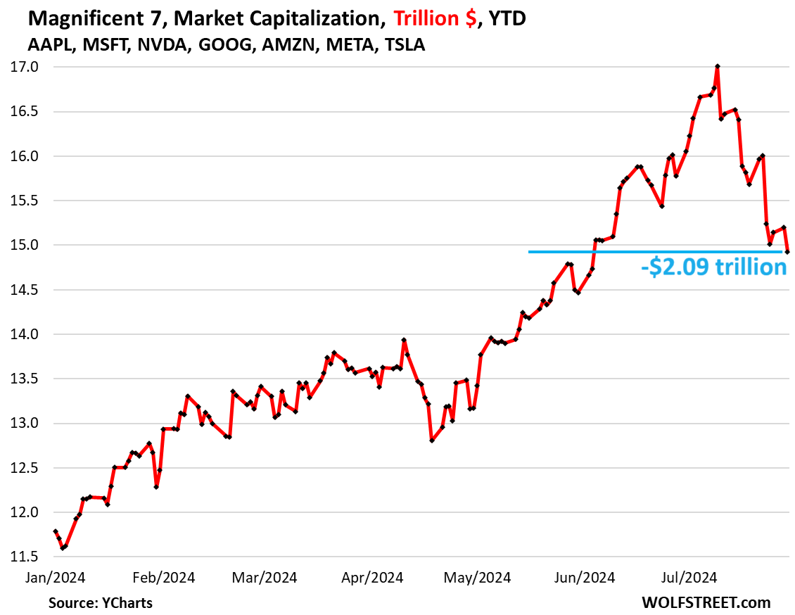 Since the peak on July 10, they have dropped by 12.3%, or by $2.09 trillion in dollar terms. The combined market cap has now fallen to $14.9 trillion, about where it had been on June 4, down from $17.0 trillion on July 10.