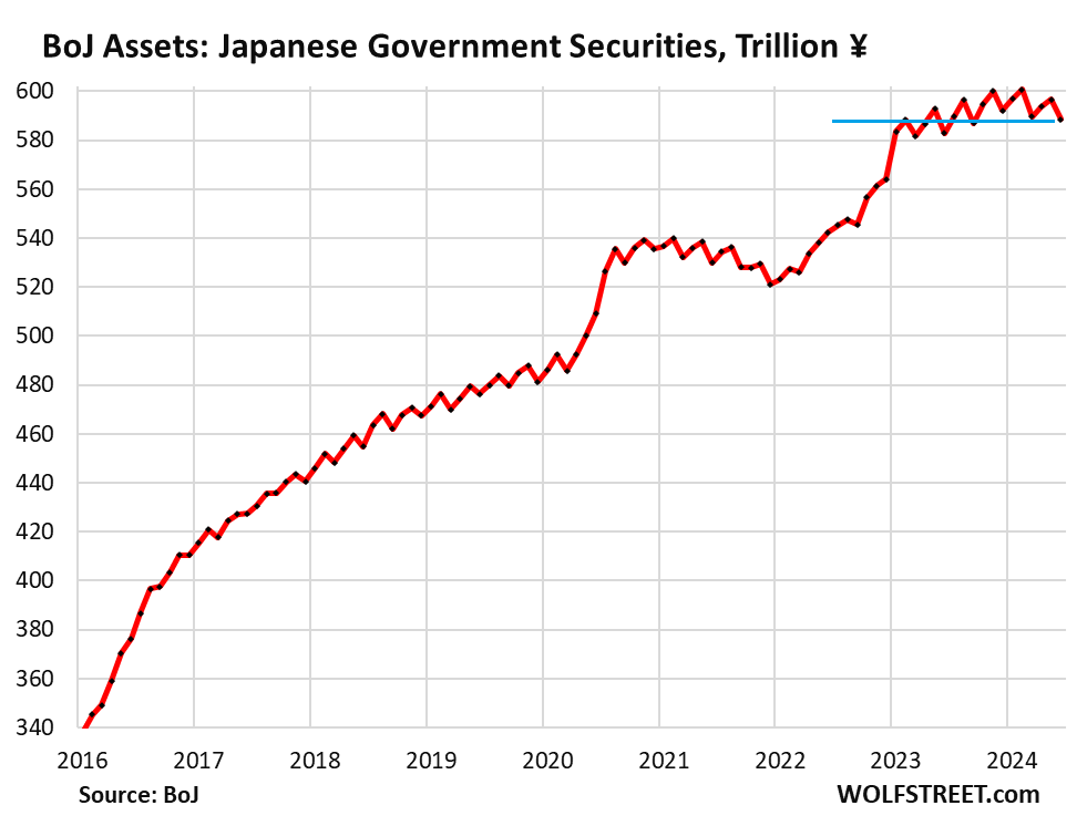 About ¥6 trillion in JGBs on its balance sheet are maturing every month. The BOJ has been replacing most of them in recent months, so that its holdings of JGBs have declined very gradually from the peak in February 2024.