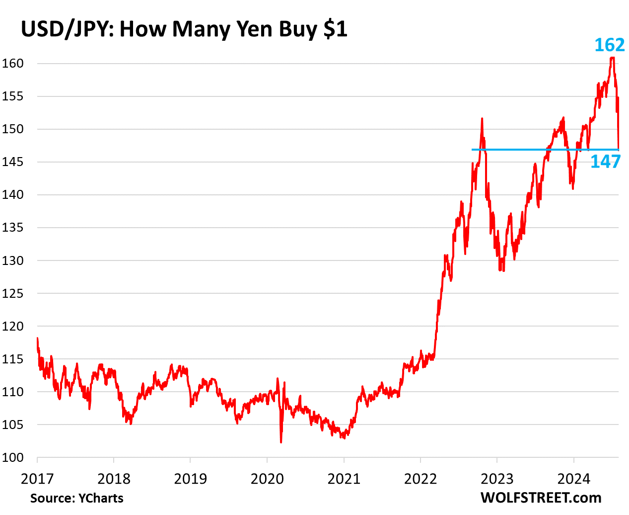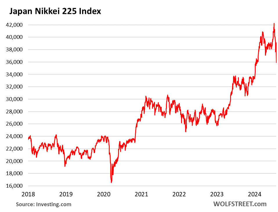 But wait… The plunge didn’t even unwind the surge in 2024. Year-to-date, the index is still up 7.3%. And since the beginning of 2023, when this massive rally began, over these 19 months, the index is still up 38%. That’s how huge this stock market craziness has been, even in Japan, with foreigners, from Buffett on down piling into the market.